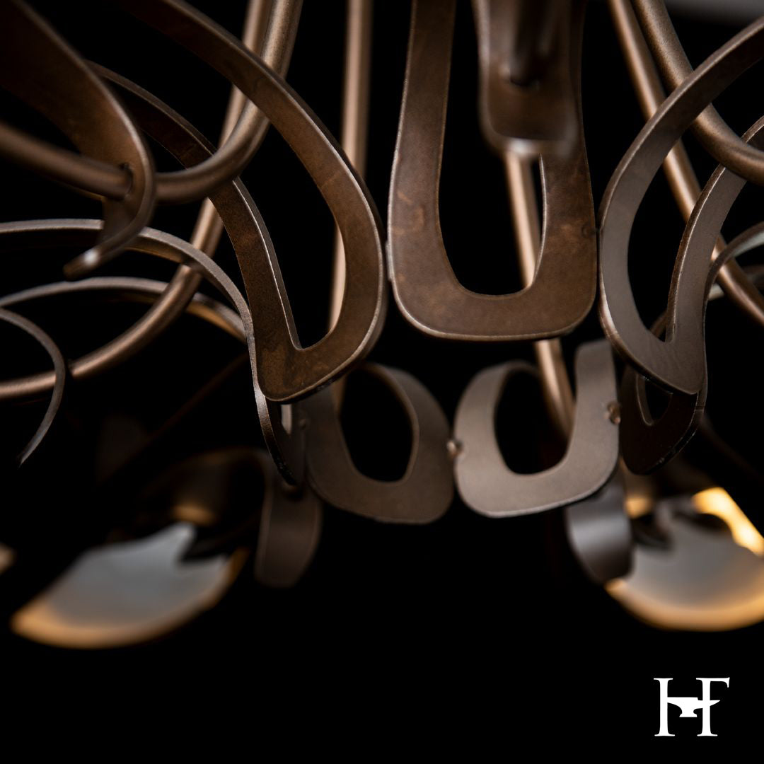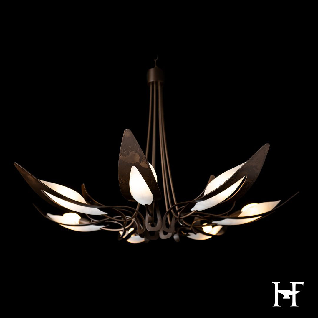 Skilled Vermont artisans hand-forge and shape this beautiful lighting fixture, reminiscent of a parasol form. The forged metal texture comes through in each detail. Handmade slumped art glass is nested into each of these seven arms. Parasol designer Jason Hancock recommends using a "milky" candelabra bulb for the perfect effect.