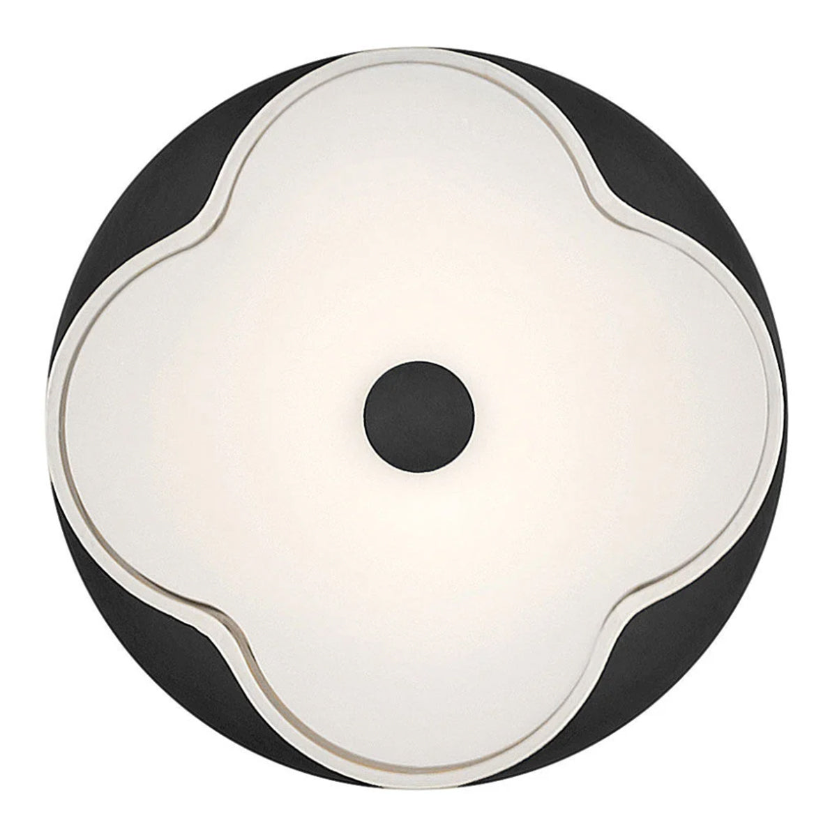 The curved quatrefoil silhouette of Delaney's off-white linen shade elegantly complements traditional aesthetics. Etched glass softly diffuses light, while an oversized decorative canopy in Heritage Brass or Black provides a subtle contrast.