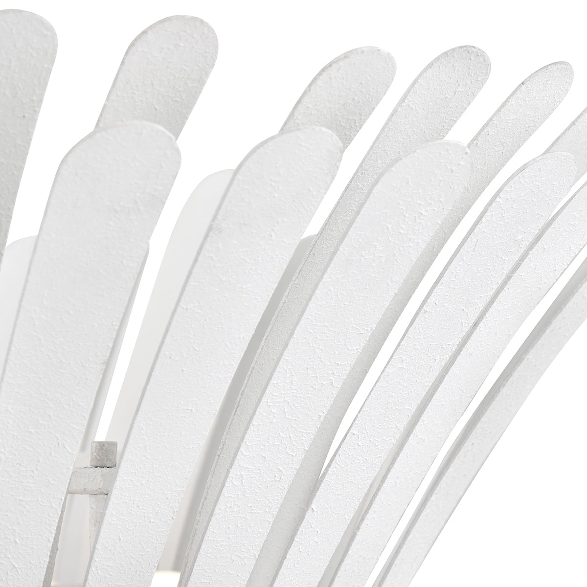 Remarkably dramatic, Reina’s repeating flared fronds surround its central drum and etched white glass diffuser, making a refined yet striking statement within any space. A Distressed Brass finish creates a classic look while the white Textured Plaster finish provides a more modern feel.