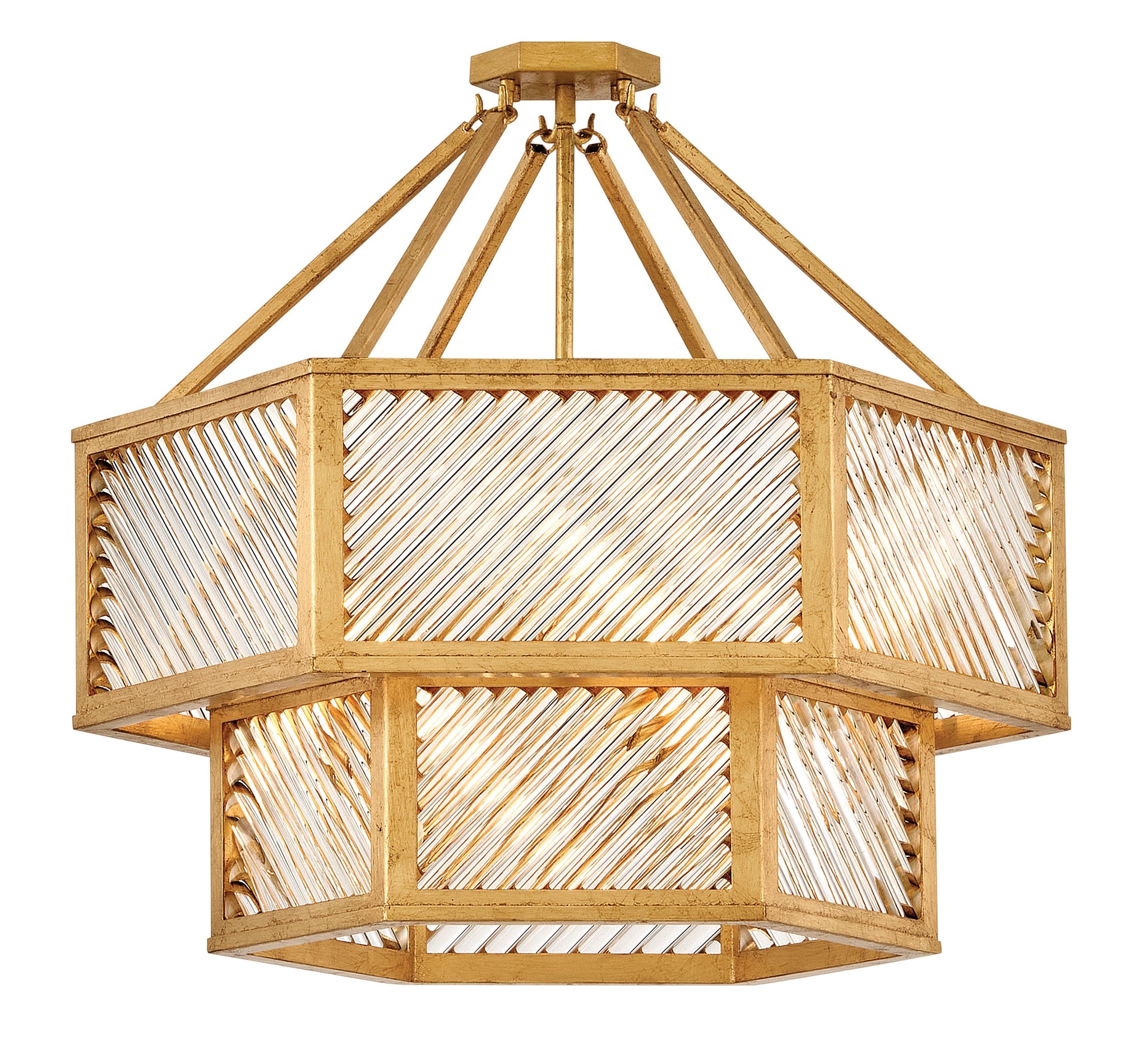 A reimagining of vintage designs from the 40s and 50s, Sura’s transitional, hexagonal Distressed Brass frame creates a glamorous yet understated and tailored appeal. Cylindrical glass rods set at alternating angles echo a soft herringbone pattern, juxtaposing geometry within geometry. Layered details create a reeded effect that is reflective and alluring.