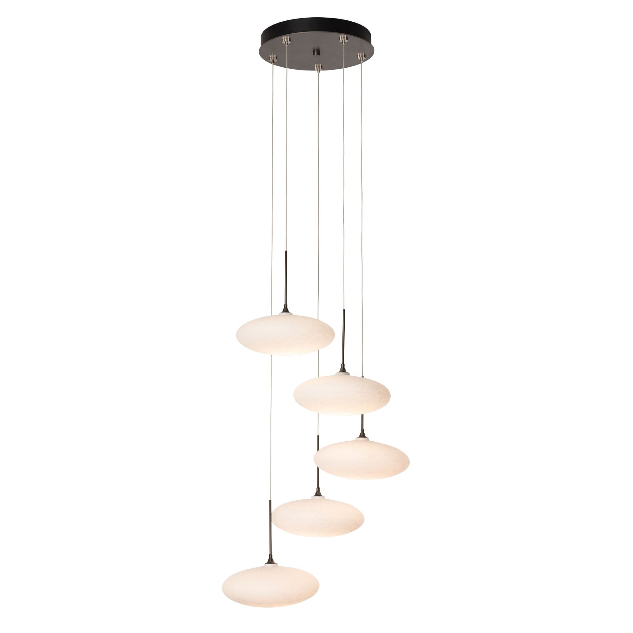 Large white tortoiseshell-like glass “puffs” inspired this collection’s name, Clouds. The ability to customize the lengths of each cable makes it possible for this versatile Clouds 5-Light fixture to serve as a semi-flush with shortened cables, or as a pendant with staggered individual lights, descending from a round canopy.