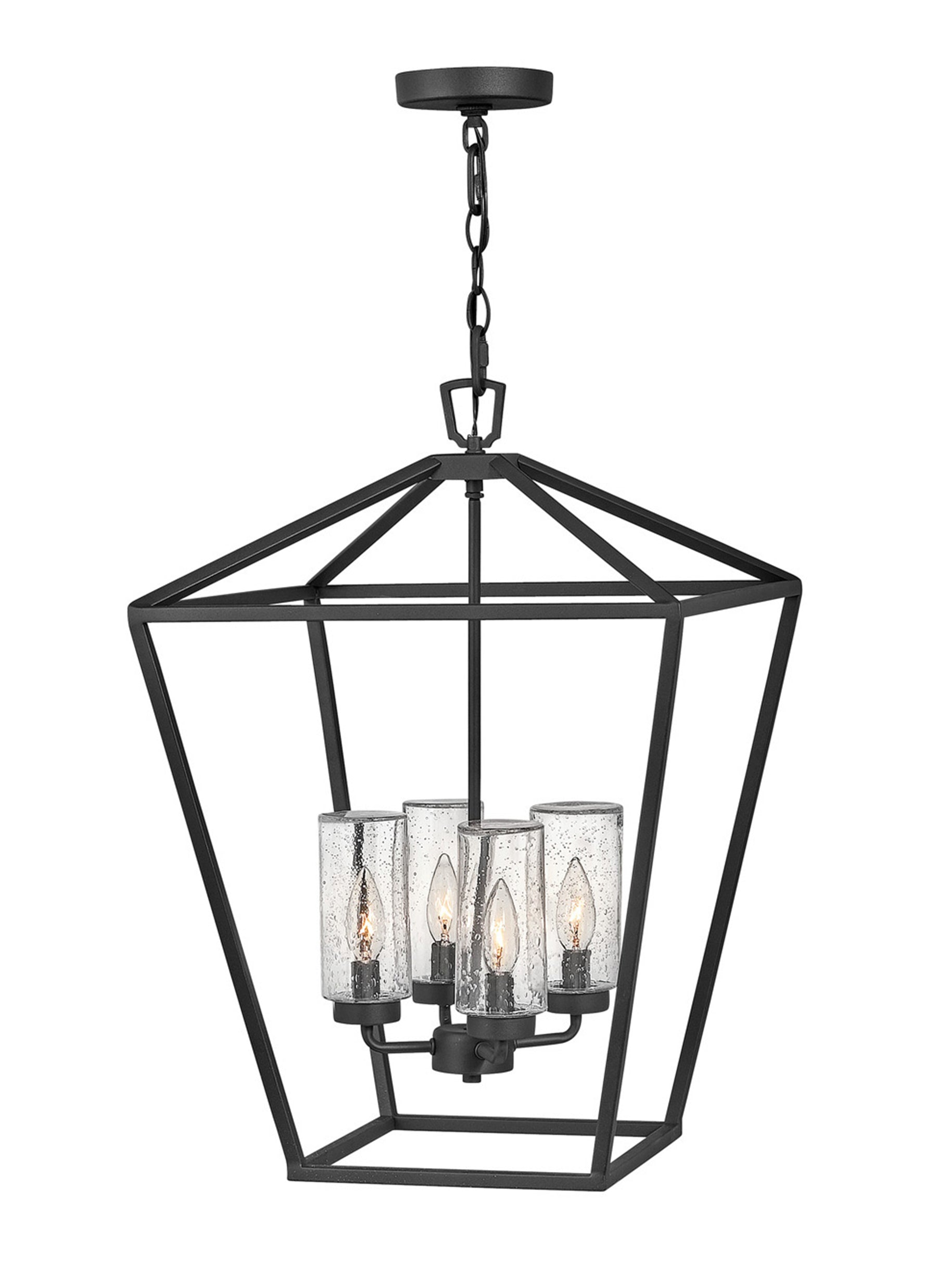 The clean and classic design of Alford Place features a traditional oversized cage entrapping a series of lamps enclosed by clear seedy glass. Available in a variety of finishes, Alford Place provides excellent illumination from all sides.