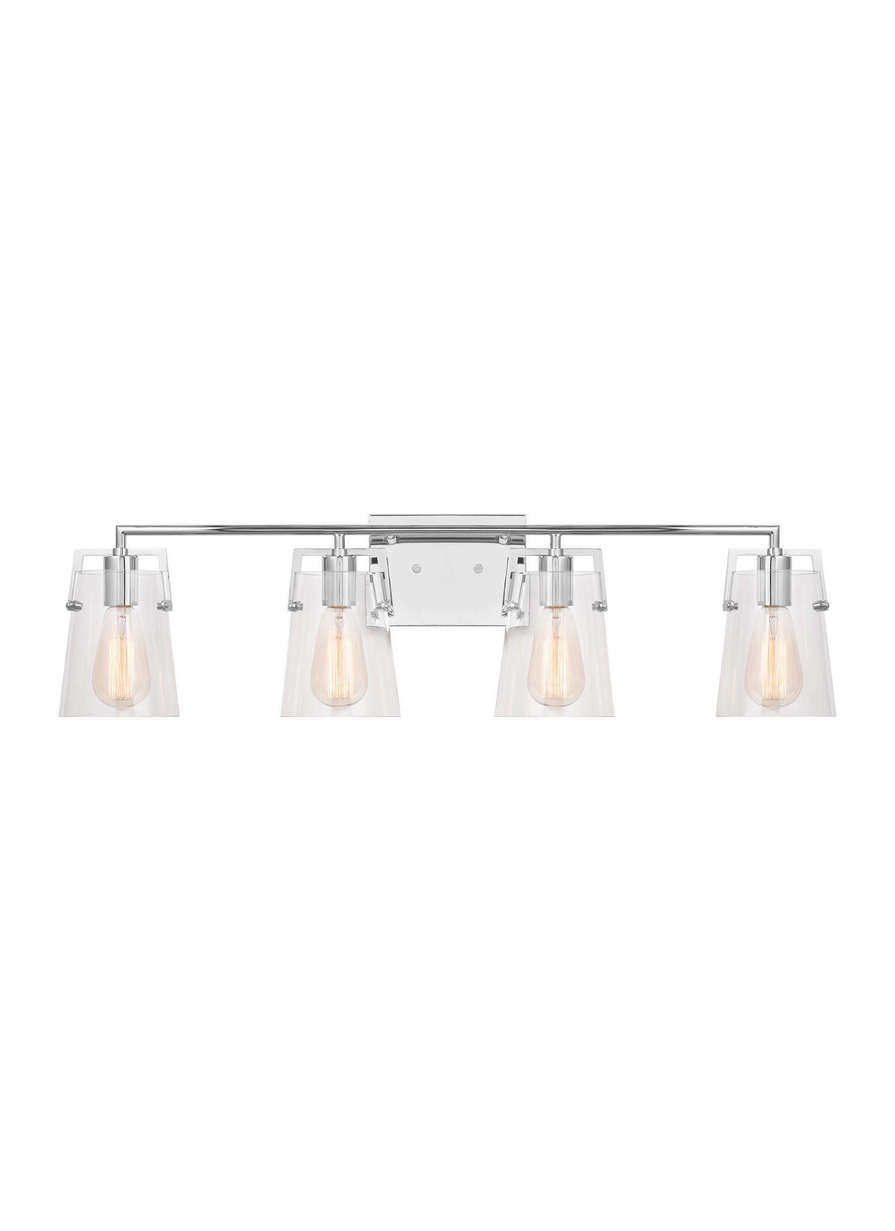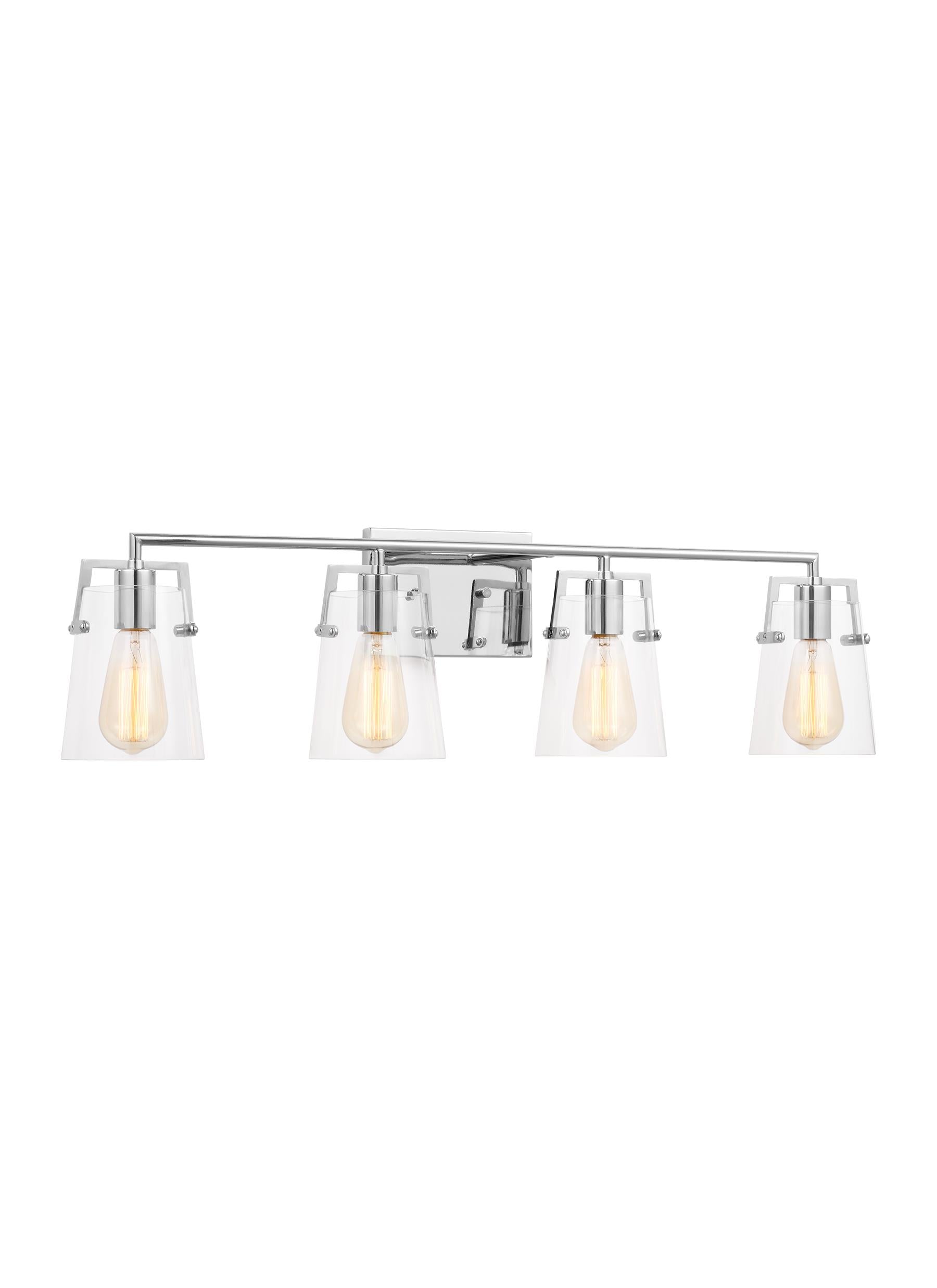 Drew & Jonathan Scott's Crofton collection fits a modern or Modern Farmhouse room, bringing pizazz in several sizes and finish options. The clear glass shades slip into a squared yoke, available in wall and pendant options in Satin Brass, Brushed Steel, Chrome or Mid-Night Black finish.