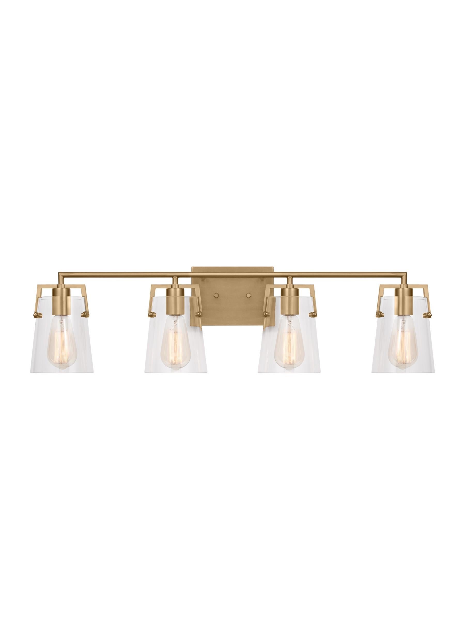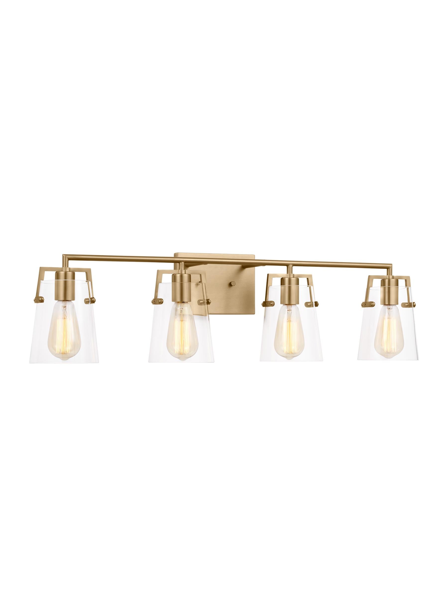 Drew & Jonathan Scott's Crofton collection fits a modern or Modern Farmhouse room, bringing pizazz in several sizes and finish options. The clear glass shades slip into a squared yoke, available in wall and pendant options in Satin Brass, Brushed Steel, Chrome or Mid-Night Black finish.