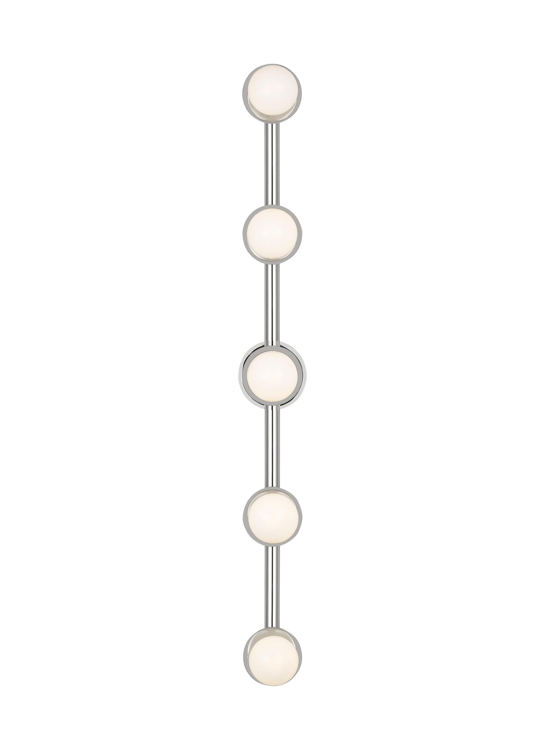 Nodes wall lighting is minimal yet bold, highlighting Kelly's distinctive juxtaposition of mixed-materiality and curvilinear form. Light radiates from milk glass globes set against metal discs. All fixtures can be used or without the discs.