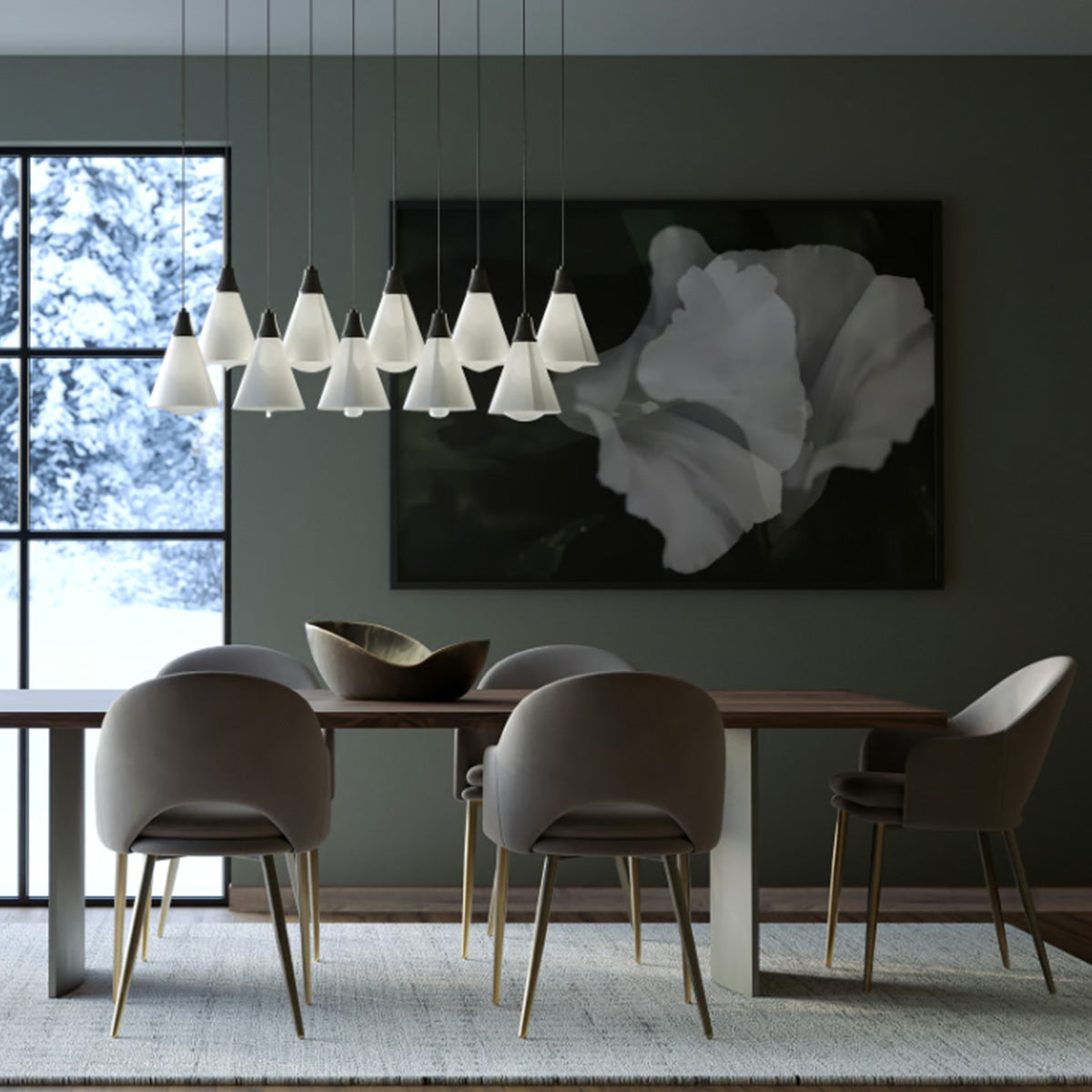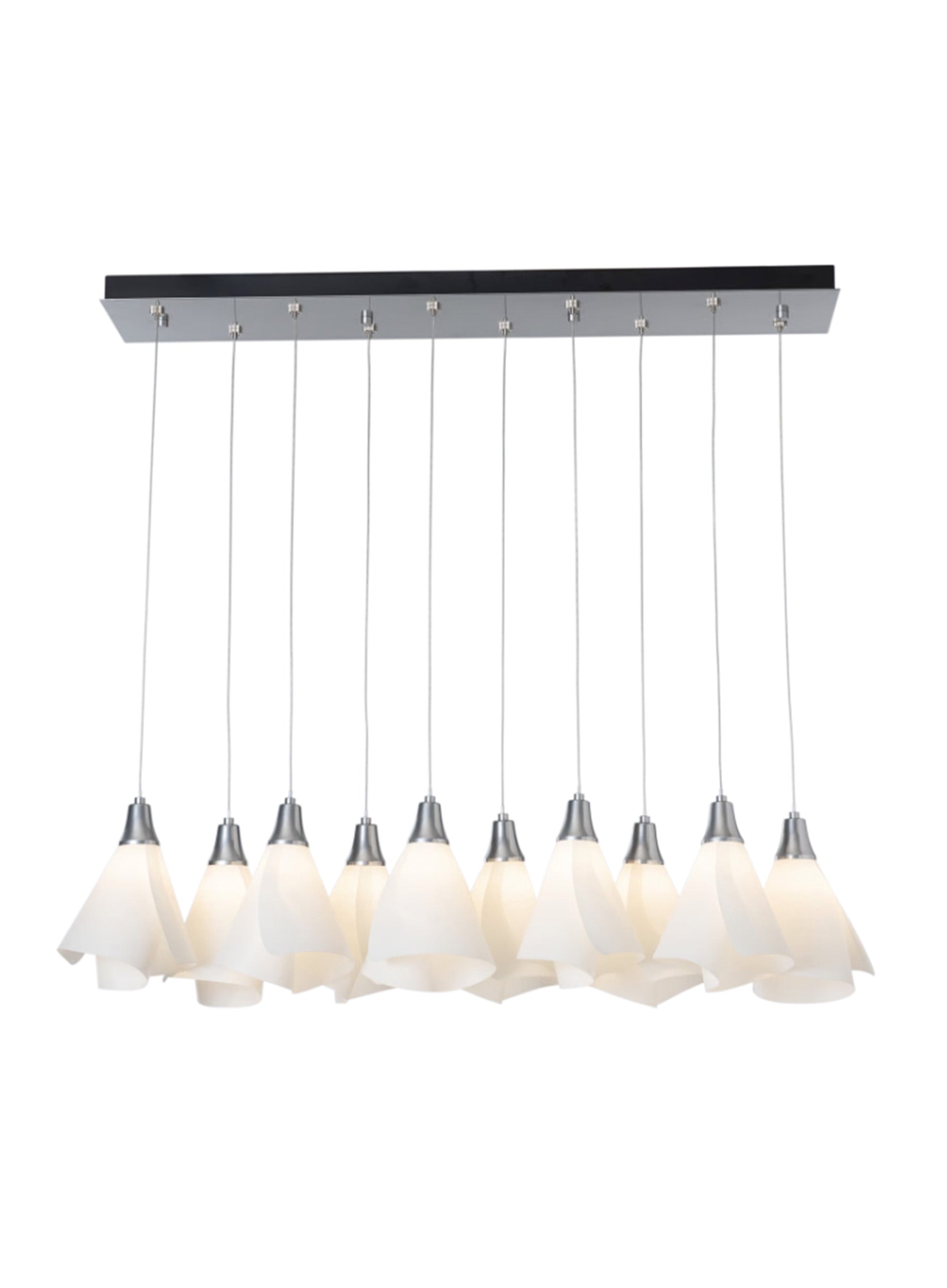 Graceful Mobius spun-frost shades seem to float in space from the rectangular canopy above. With the ability to customize each shade's positioning, whether you prefer the 10 lights to be aligned or staggered heights, the Mobius 10-Light fixture features a double linear multi-port.