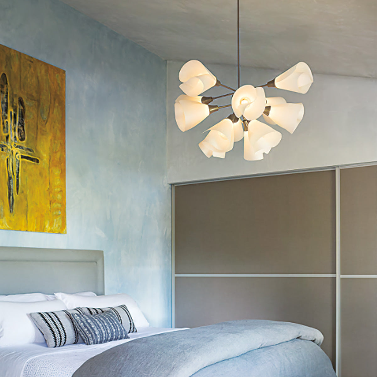 Like a bouquet of delicate blooms, the new 12-Light Mobius Pendant is light and airy, featuring spun frost "petals" for shades. The "stem" is available in a choice of nine finishes, and in three lengths. This elegant pendant creates a burst of botanical beauty in any space.