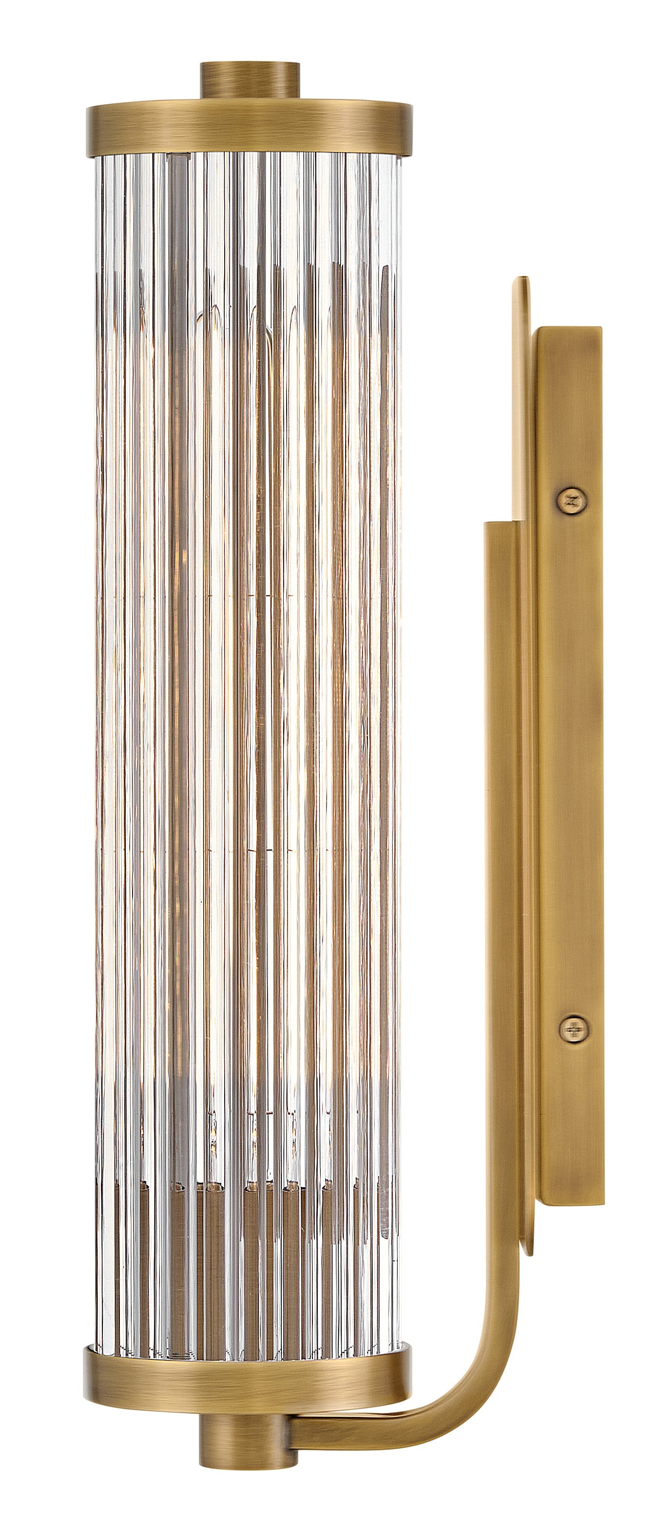 A touch of modern style and vintage charm, Ellery’s Clear glass shade is composed of tall cylindrical glass rods, creating a beautiful reeded effect when illuminated. A large rectangular backplate and matching end caps are finished in a Black Oxide, Heritage Brass, or Polished Nickel finish that complements any bath or living space.